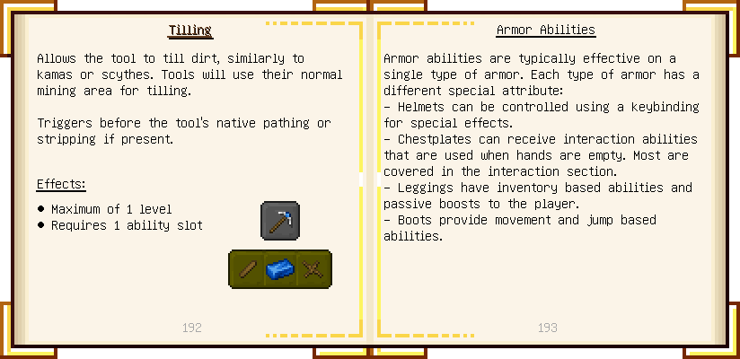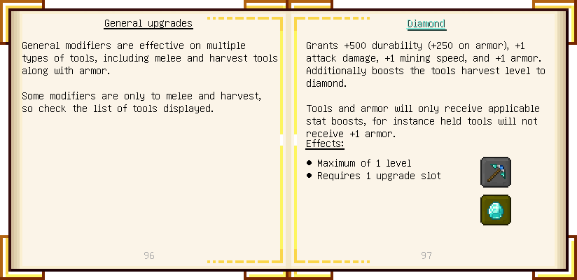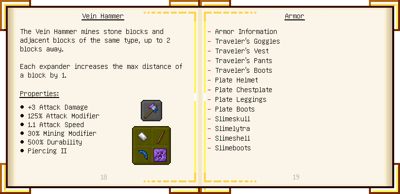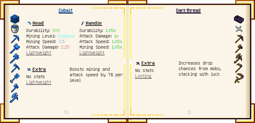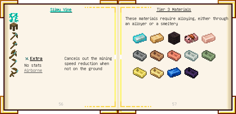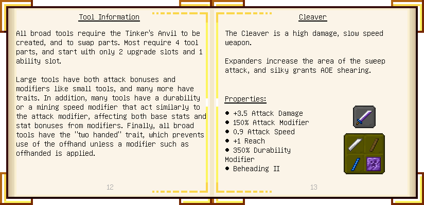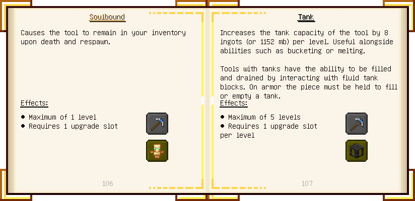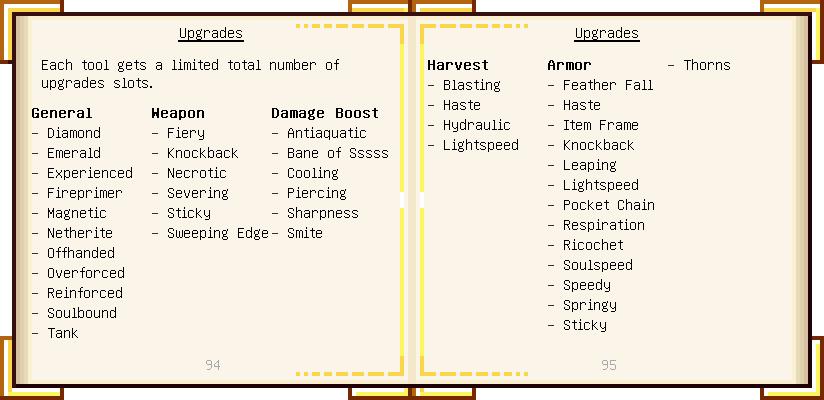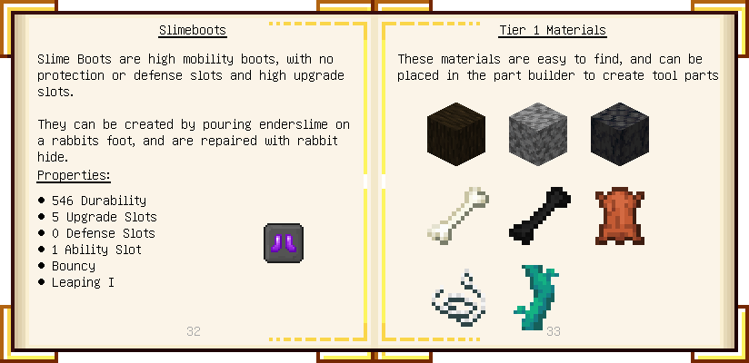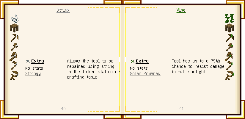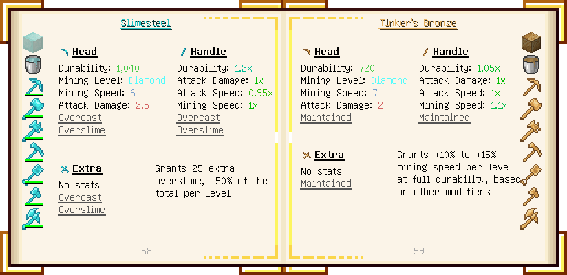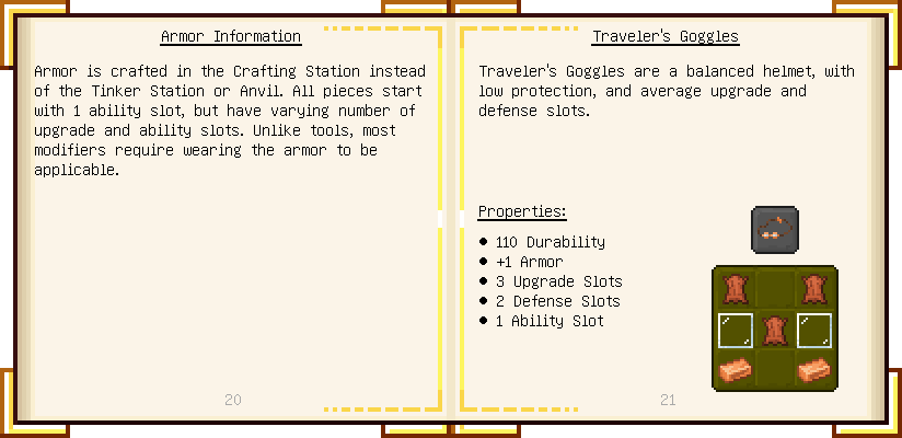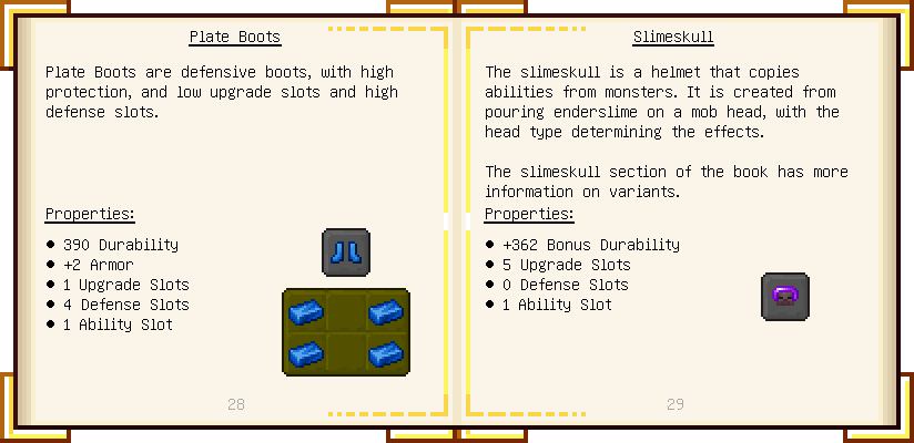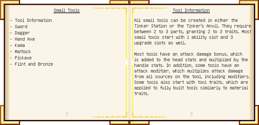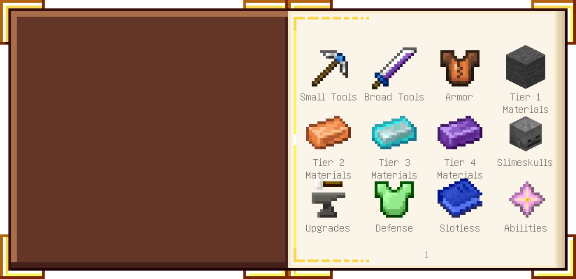 Home / Documentation / Book Index / 1.16 / Encyclopedia of Tinkering Encyclopedia of Tinkering (1.16) Tinkers' Gadgetry See below for images of all pages in Encyclopedia of Tinkering. Click a page to view in gallery mode. Tools Armor Materials Slimeskulls Upgrades Defense Slotless Abilities