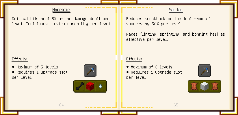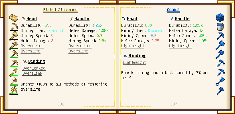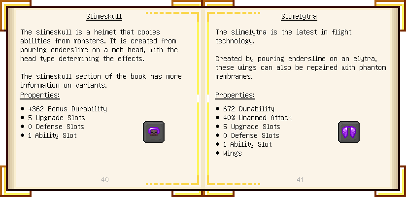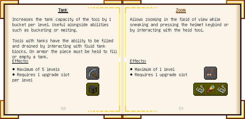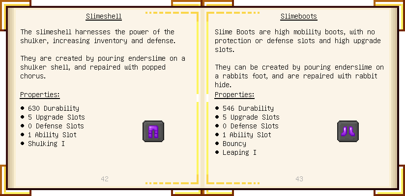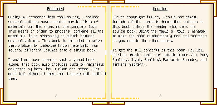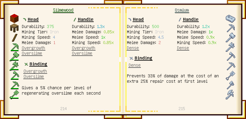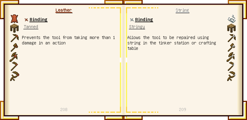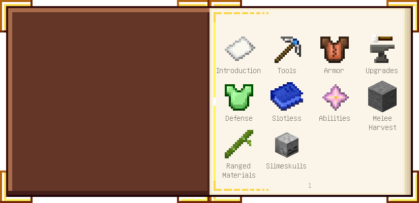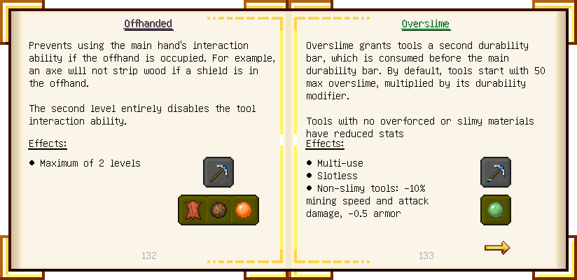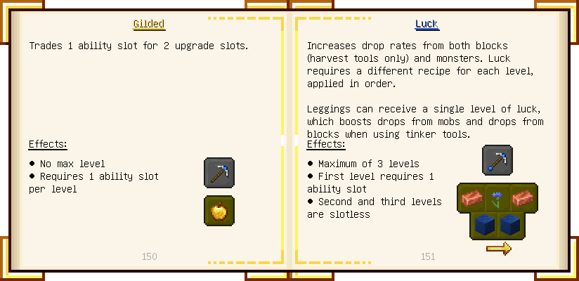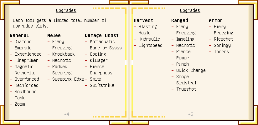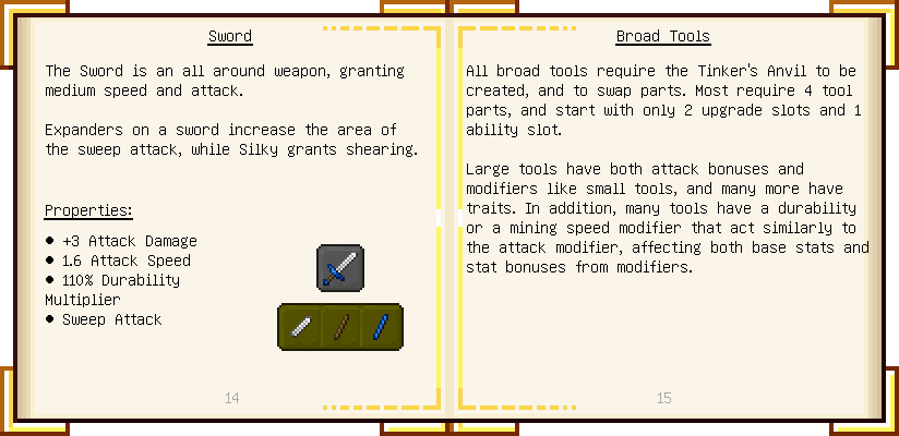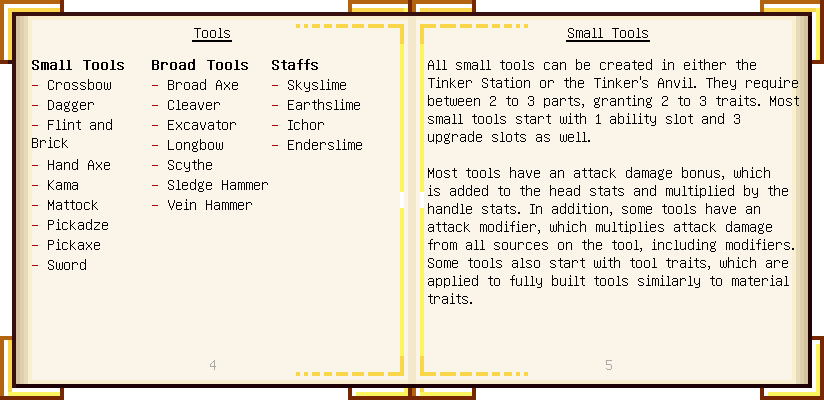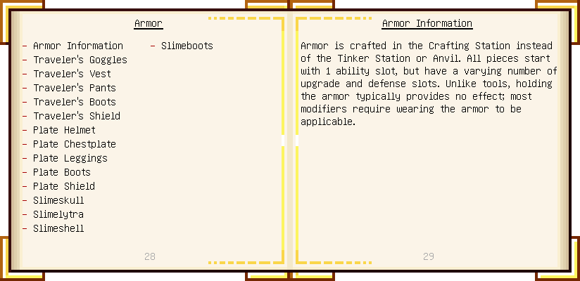 Home / Documentation / Book Index / 1.18 / Encyclopedia of Tinkering Encyclopedia of Tinkering (1.18) Tinkers' Gadgetry See below for images of all pages in Encyclopedia of Tinkering. Click a page to view in gallery mode. Tools Armor Upgrades Defense Slotless Abilities Melee Harvest Materials Ranged Materials Slimeskulls