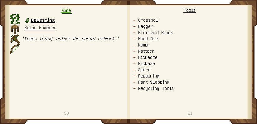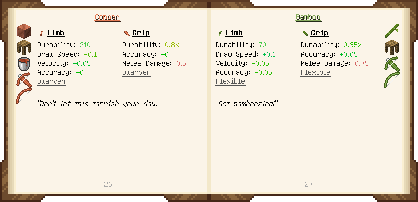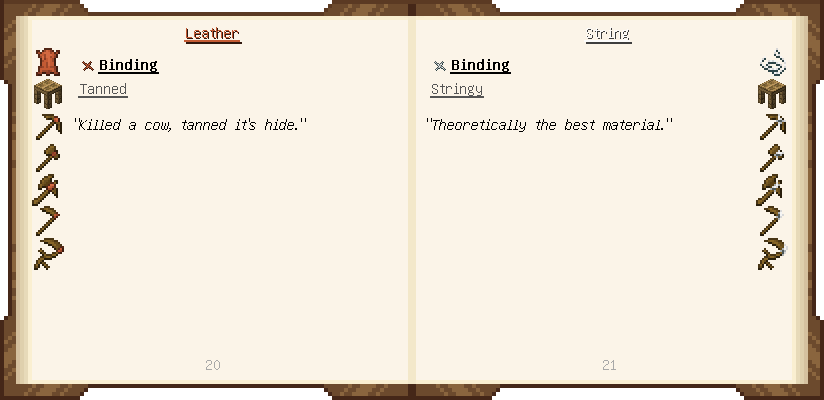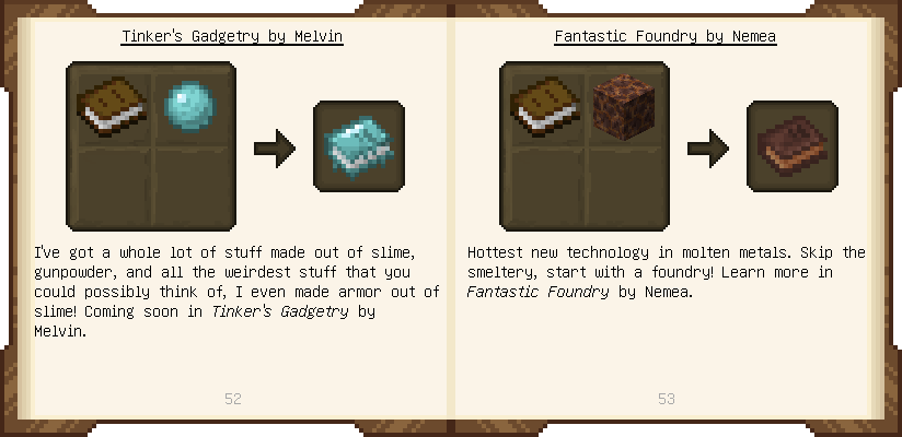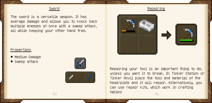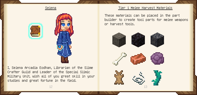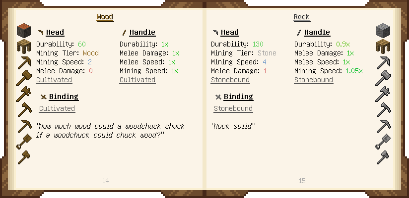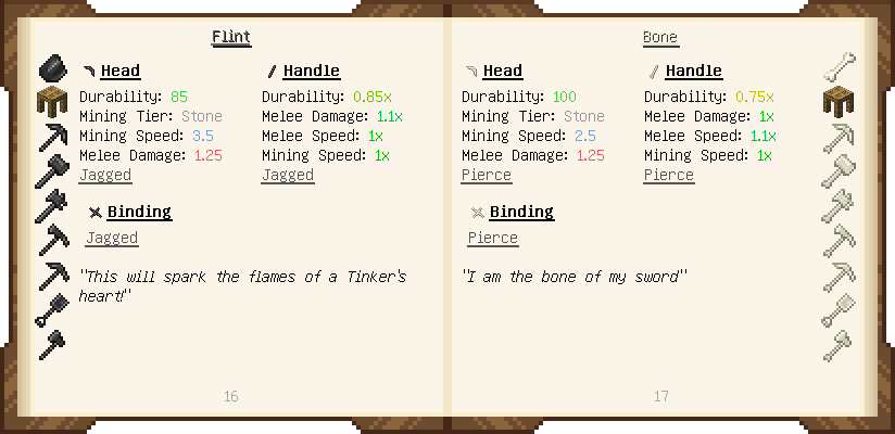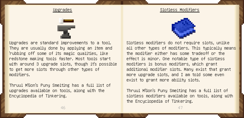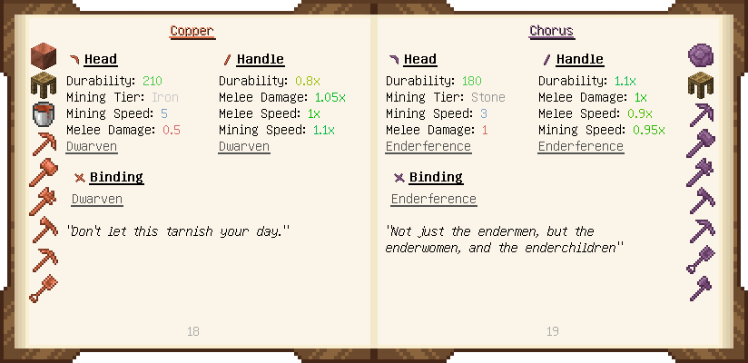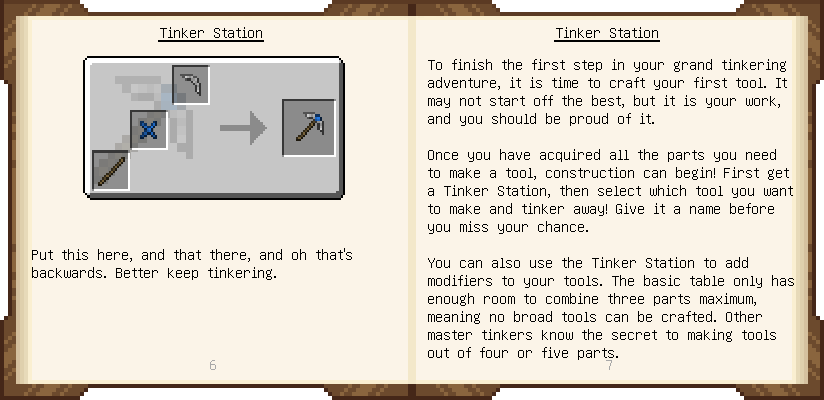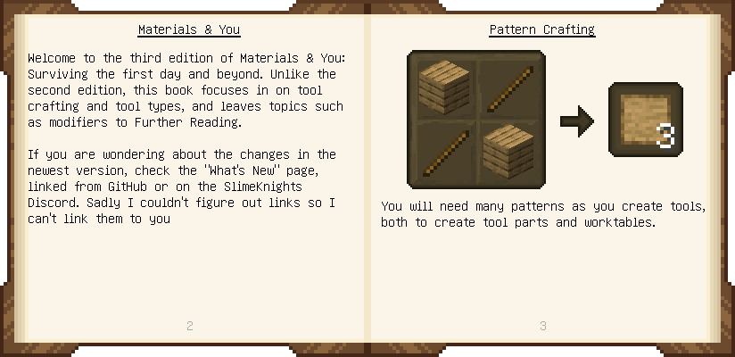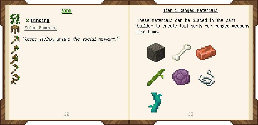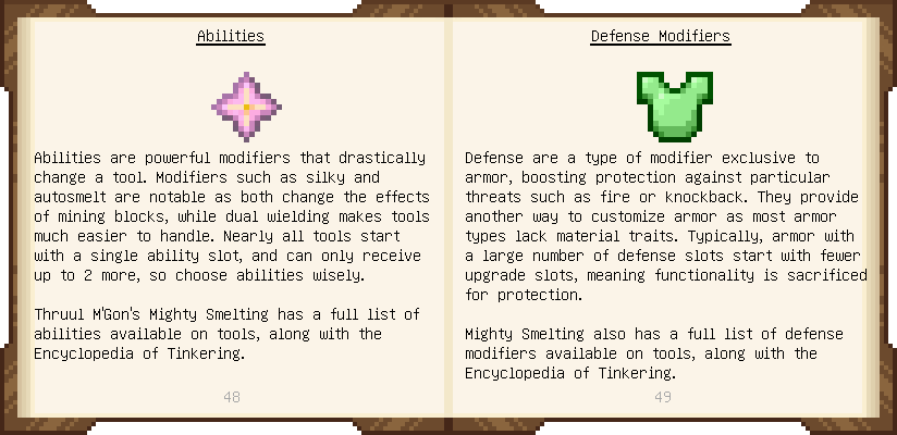 Home / Documentation / Book Index / 1.18 / Materials and You Materials and You (1.18) Puny Smelting See below for images of all pages in Materials and You. Click a page to view in gallery mode. Introduction Tier 1 Melee Harvest Tier 1 Ranged Tools Modifiers Further Reading