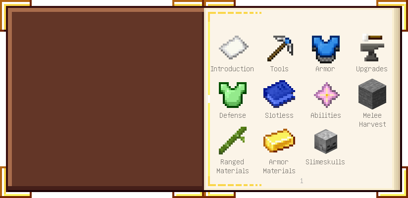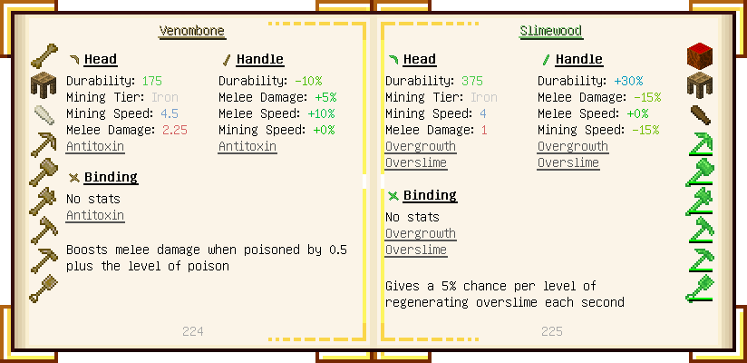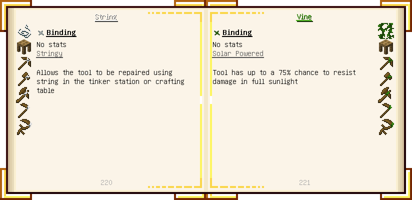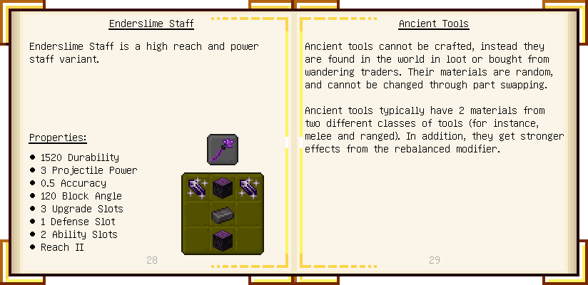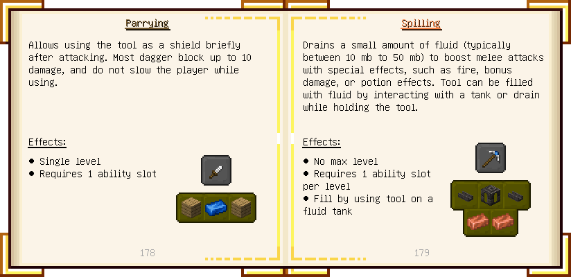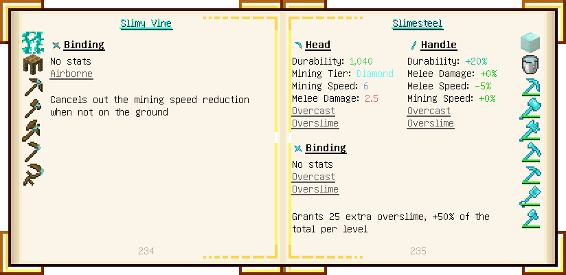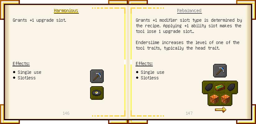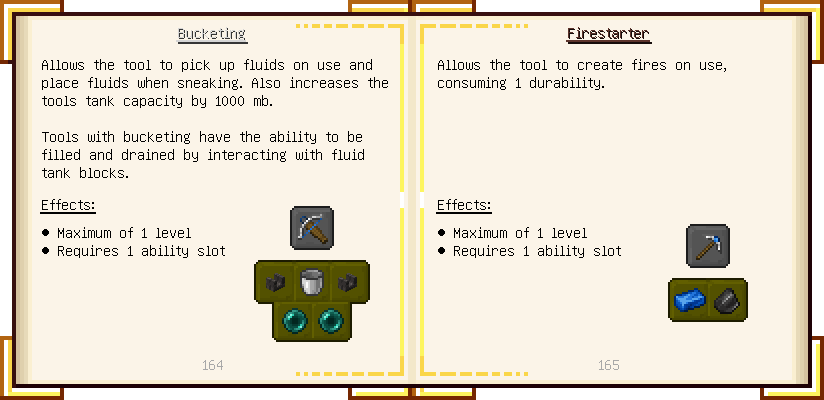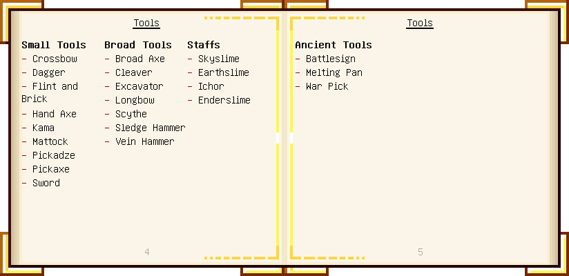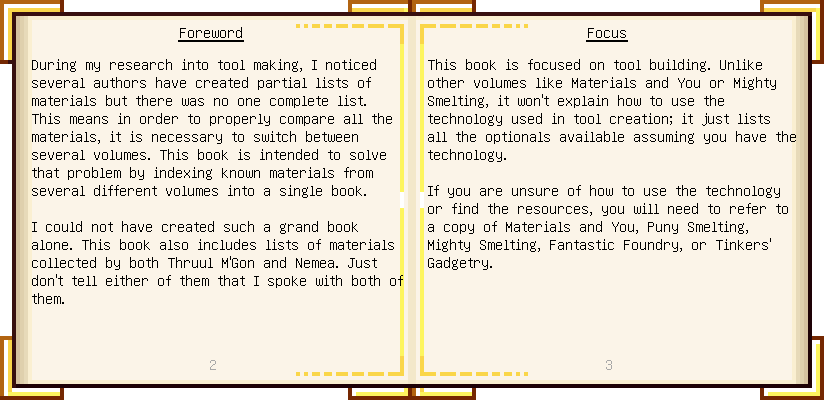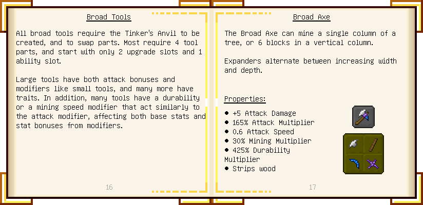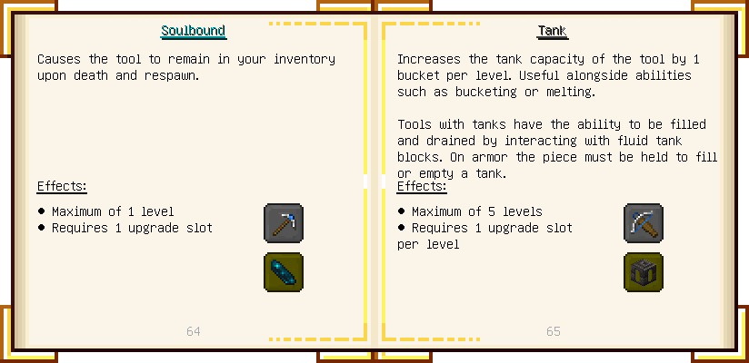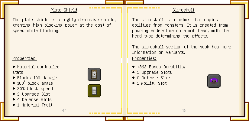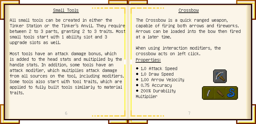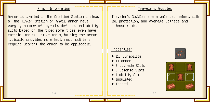 Home / Documentation / Book Index / 1.19 / Encyclopedia of Tinkering Encyclopedia of Tinkering (1.19) Tinkers' Gadgetry See below for images of all pages in Encyclopedia of Tinkering. Click a page to view in gallery mode. Tools Armor Upgrades Defense Slotless Abilities Melee Harvest Materials Ranged Materials Armor Materials Slimeskulls