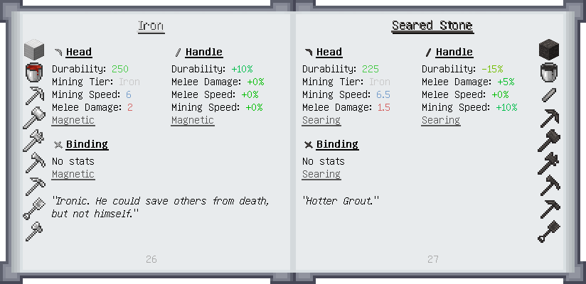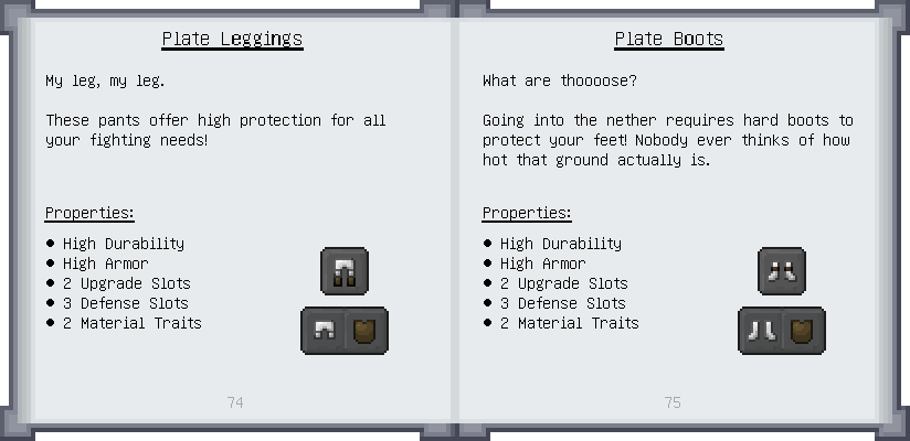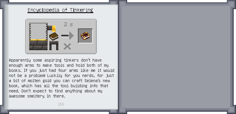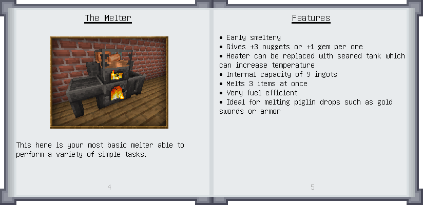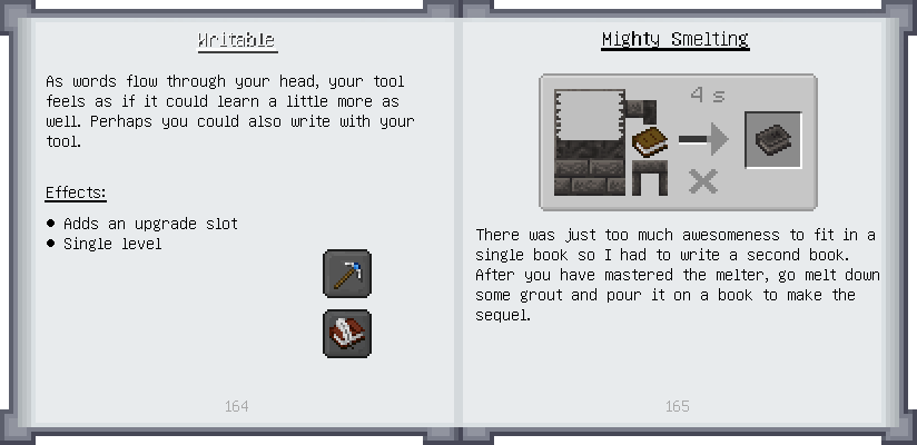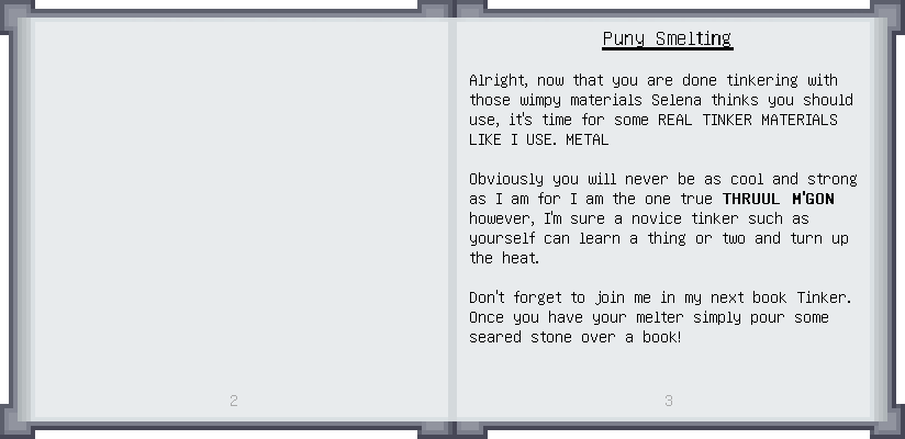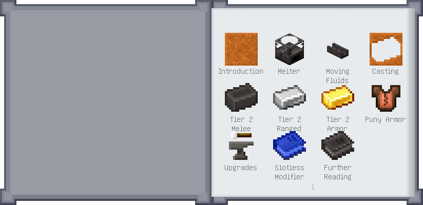 Home / Documentation / Book Index / 1.19 / Puny Smelting Puny Smelting (1.19) Materials and You Mighty Smelting See below for images of all pages in Puny Smelting. Click a page to view in gallery mode. Melter & Moving Fluids Casting Tier 2 Melee Harvest Tier 2 Ranged Tier 2 Armor Puny Armor Upgrades Slotless Modifiers Further Reading