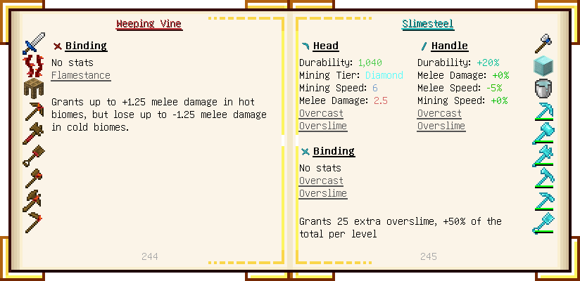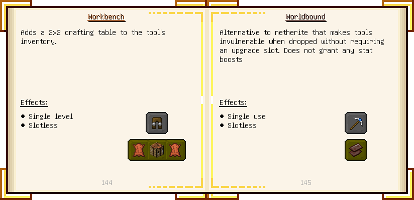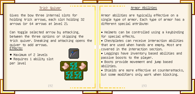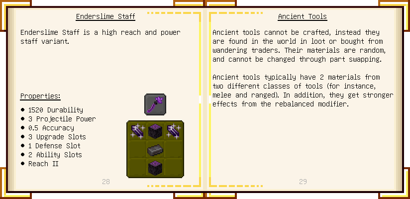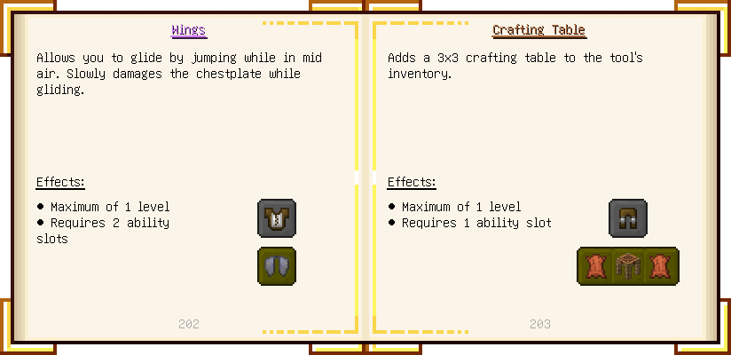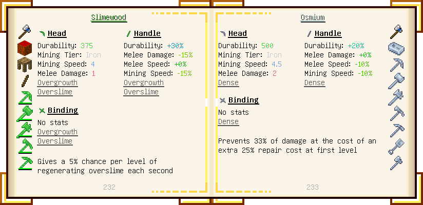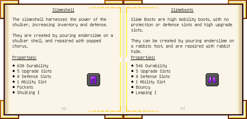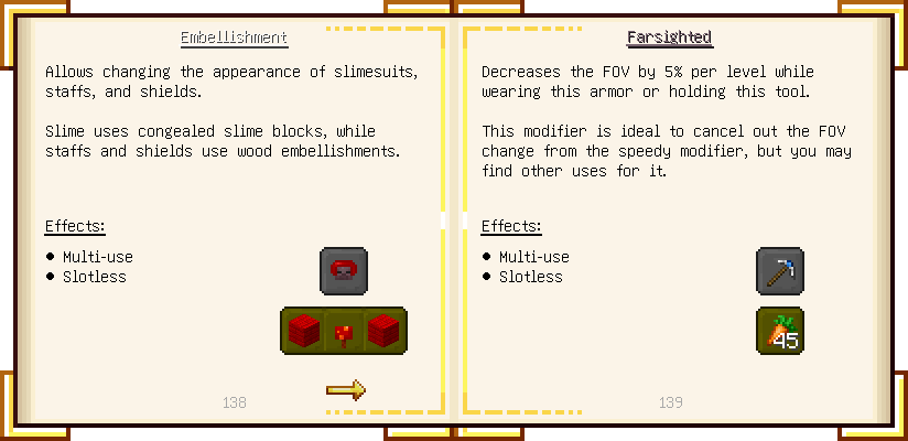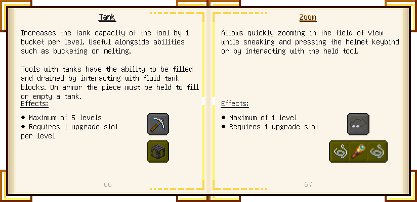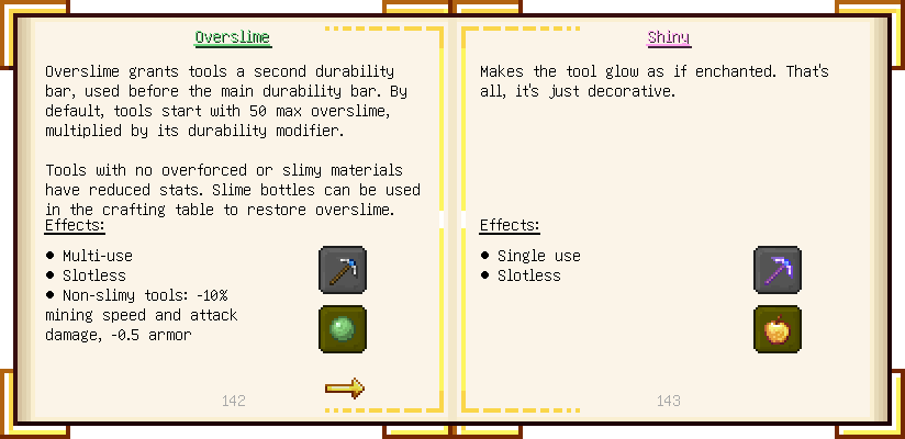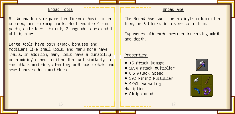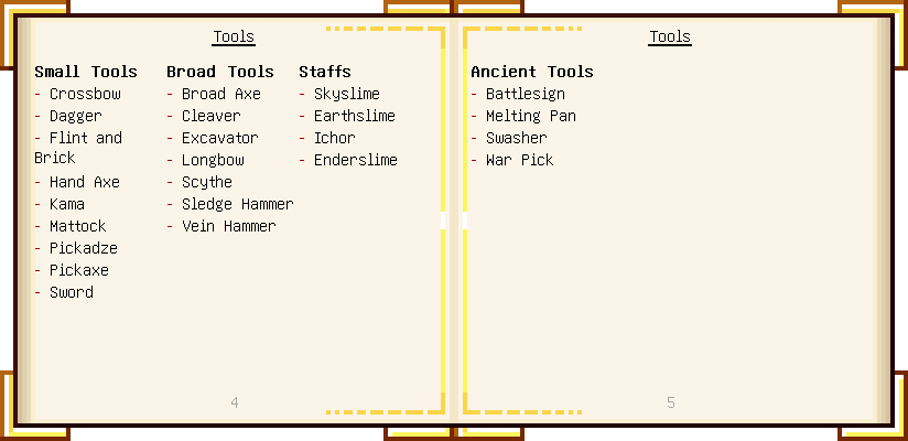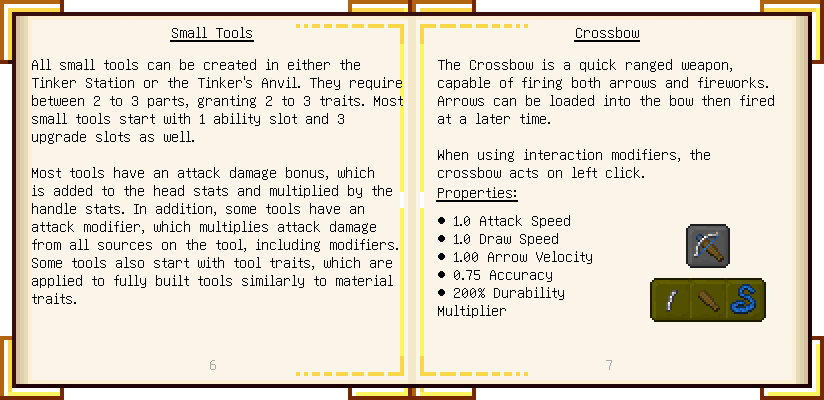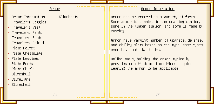 Home / Documentation / Book Index / 1.20 / Encyclopedia of Tinkering Encyclopedia of Tinkering (1.20) Tinkers' Gadgetry See below for images of all pages in Encyclopedia of Tinkering. Click a page to view in gallery mode. Introduction Tools Armor Upgrades Defense Slotless Abilities General Materials Ranged Materials Armor Materials Slimeskulls Fluid Effects