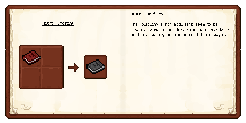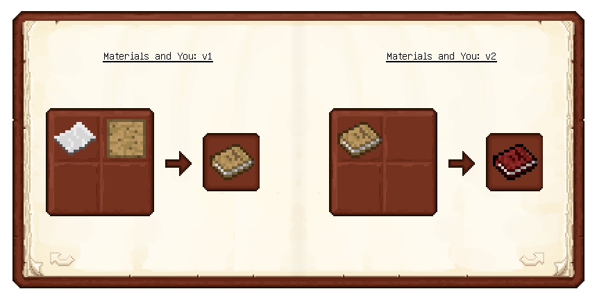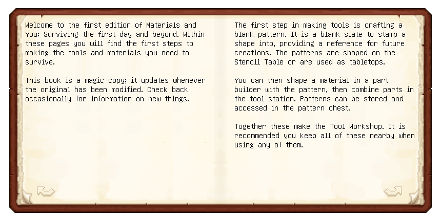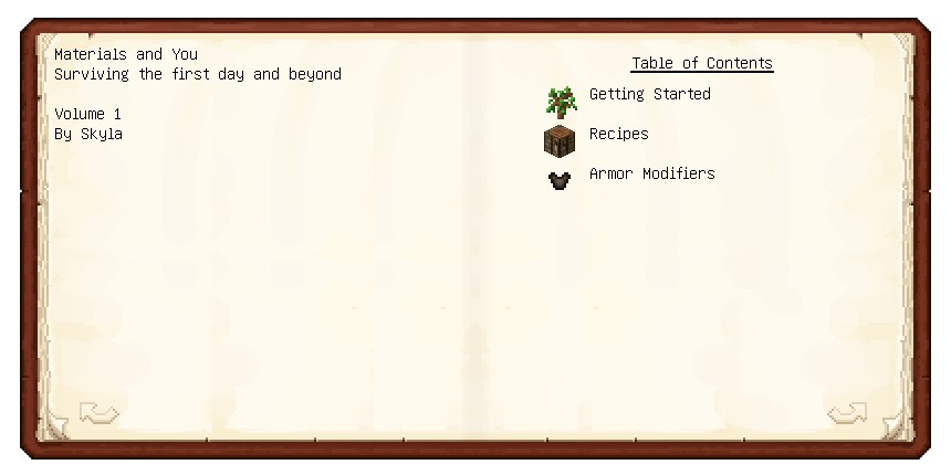Home / Documentation / Book Index / 1.7 / Materials and You: Volume 1 Materials and You: Volume 1 (1.7) Materials and You: Volume 2 See below for images of all pages in Materials and You: Volume 1. Click a page to view in gallery mode. Getting Started Recipes Armor Modifiers