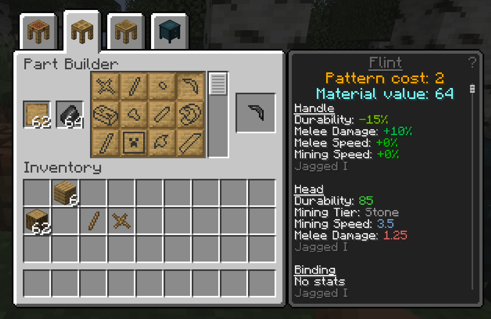 The part builder will let you turn raw materials into tool parts, though right now you can only work with basic materials such as wood or stone. To create a part, simply place patterns in the left slot and an appropriate material in the right slot, then click a stencil button to select the part you want.