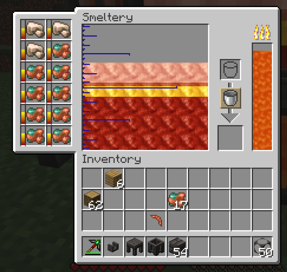 The smeltery allows melting down many ores at once, along with creating alloys from mixing different molten metals.