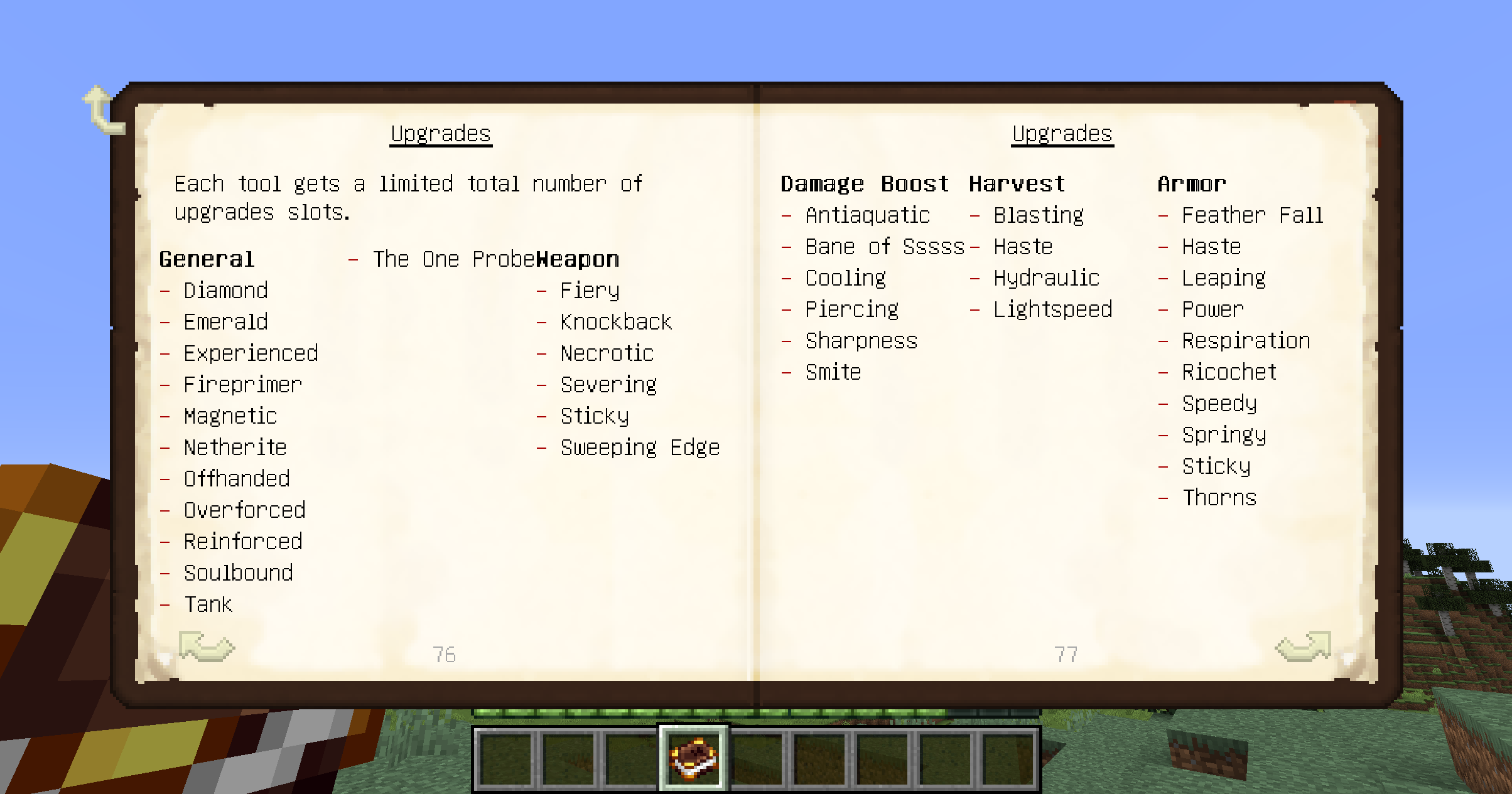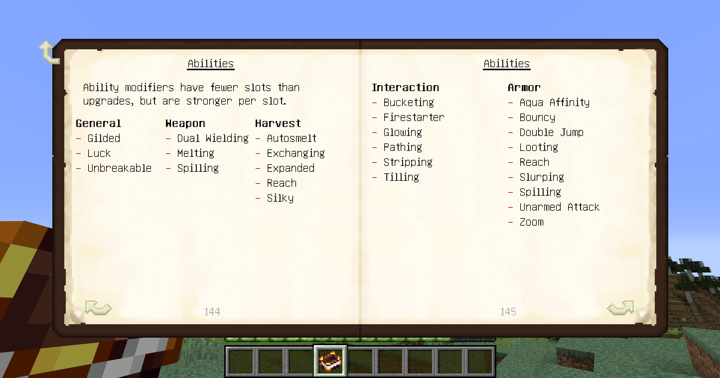 To conclude, some highlights of armor abilities. Tool abilities such as gilded or unbreakable are available, along with many new ones such as bouncy (like slime boots, before, but a modifer), double jump, slurping (lets you drink fluids in your helmet for effects), and unarmed attack (lets you punch with both hands and modify the damage of an empty hand).