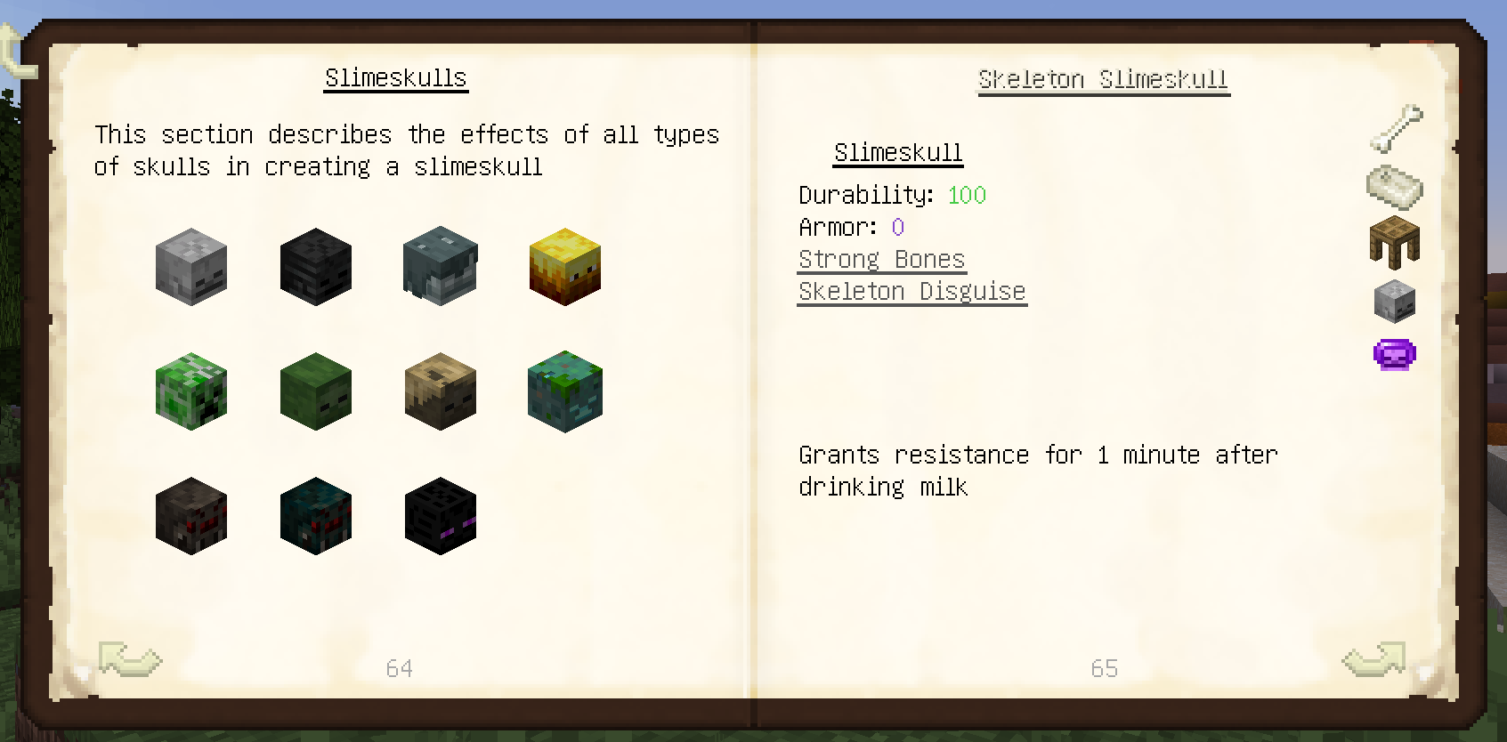 For more information on the slimeskulls, there are 11 different currently supported skulls which each have a unique ability. Examples include spreading negative potion effects to enemies, attacking enemies with blaze fireballs, teleporting to dodge arrows, and exploding like a creeper.