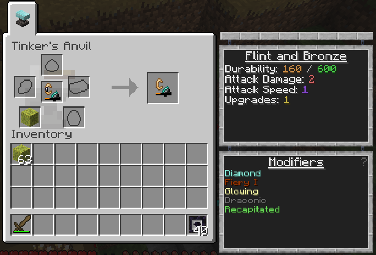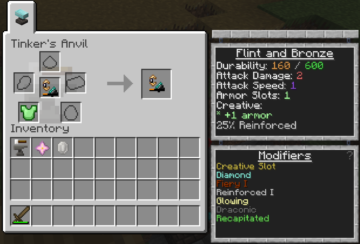 To start things off, we have a new tool that I am particularly excited about: flint and bronze. Its essentially a modifiable version of flint and steel, allowing you to light fires, ignite TNT and creepers, and create nether portals. You can apply any melee or durability based modifiers to the tool, plus all modifiers for giving additional slots