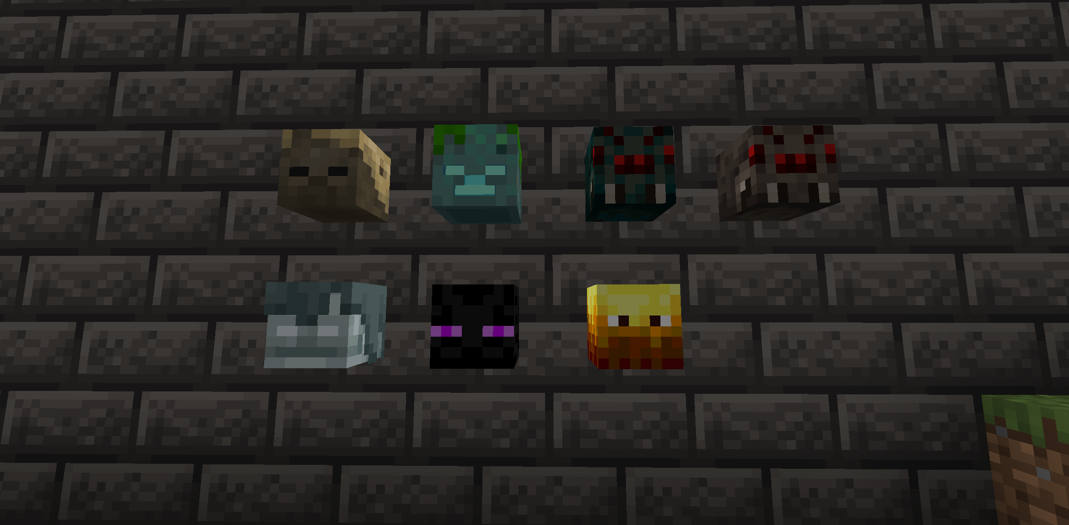 Oh, you were wondering about the blaze head? This update adds in 7 new head types in addition to the vanilla heads, so you can now behead husks, drowneds, spiders, cave spiders, strays, endermen, and blazes. These heads have all previous head functionality, meaning they reduce the distance the relevant mob sees you at, drop when killed by a tool with severing or a charged creeper, and can be used for +1 upgrade slot on tools.