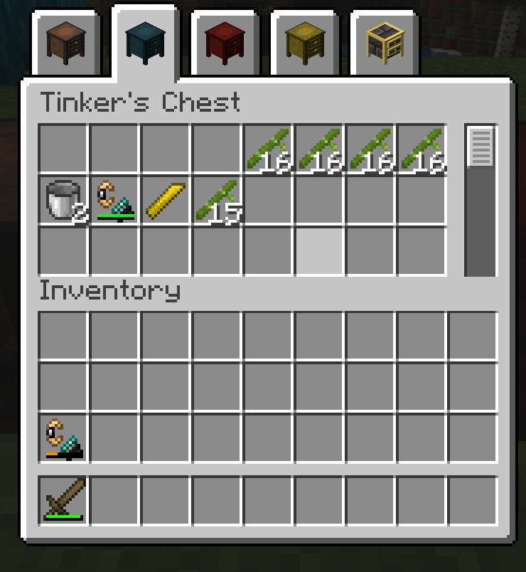 The modifier chest was renamed to the Tinker’s Chest. It now can hold any type of item instead of just modifiers, making it a chest with 64 slots but a smaller stack size per slot. In addition, the chest can be dyed to help with identifying them in the tabs.