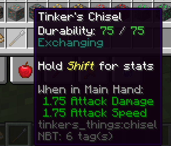 The first feature in this addon is the Tinker’s Chisel. The chisel is an early game pickaxe, crafted from flint and sticks in a crafting table. It notably can be crafted without any tool parts and without a pickaxe, making it perfect for getting that first bit of stone before you construct your proper tools. Its also great in later game as it has the exchanging modifier, letting you swap mined blocks for the block in the offhand.