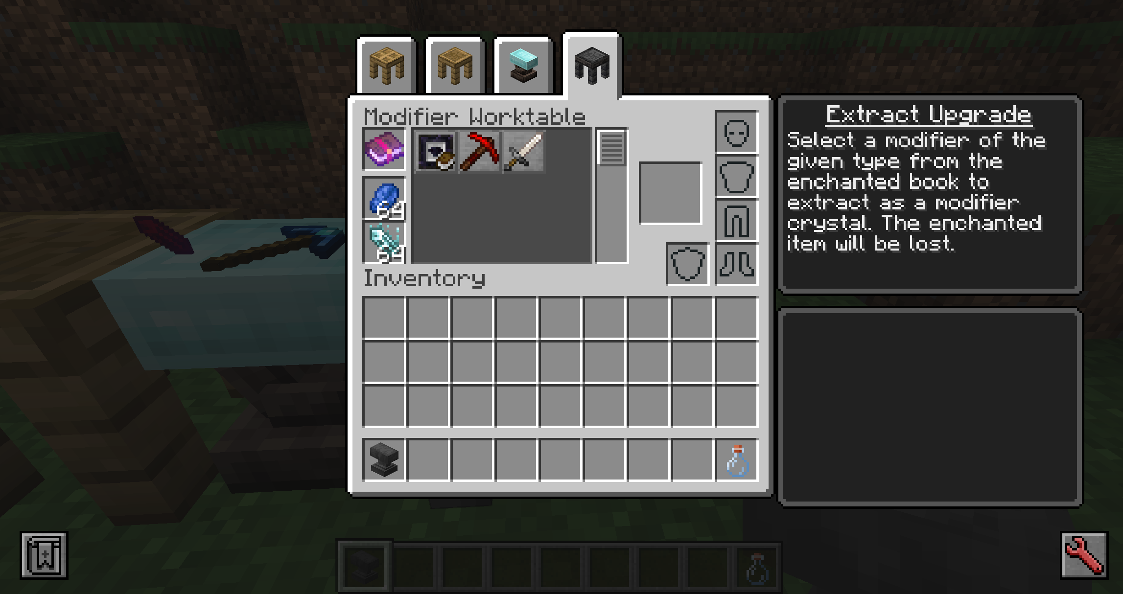 By default, we support vanilla enchantments along with enchantments from several mods such as Cyclic and Encorselation, making this a viable method of getting modifiers in larger packs. It is controlled by JSON, allowing packs to add more enchantments to the list or outright disable the feature.