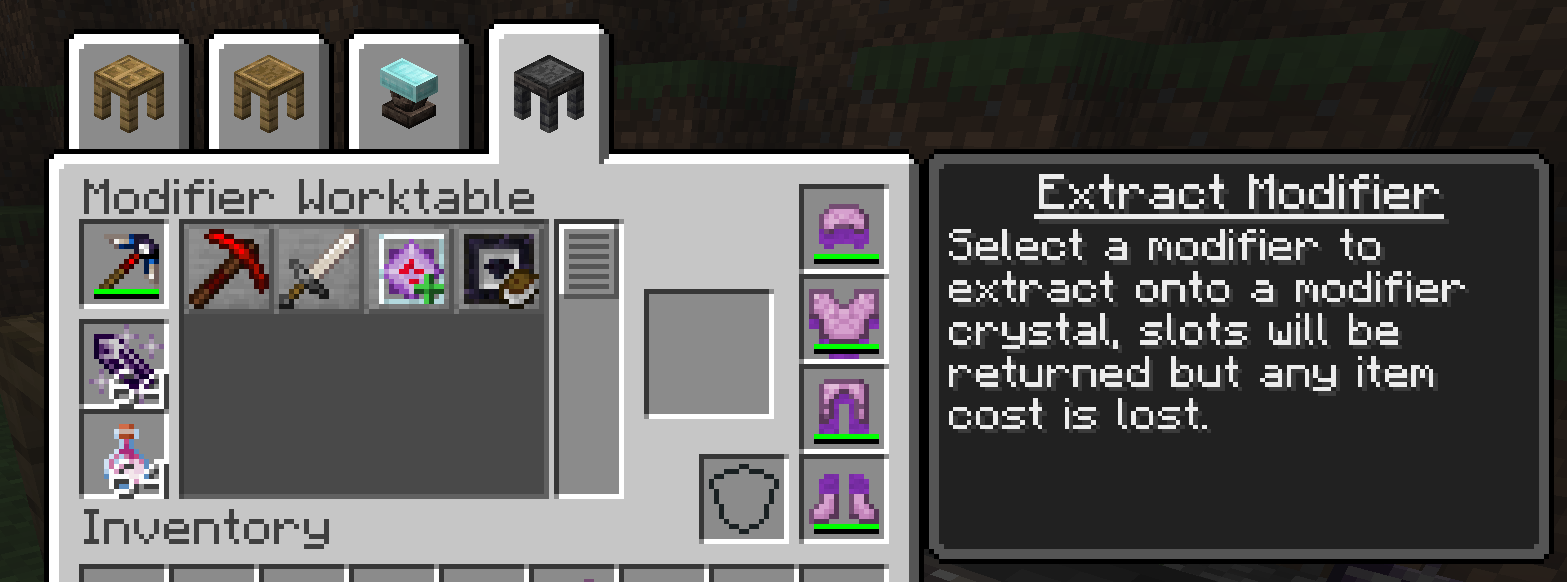 Another method to get modifier crystals is to extract them from a tool. This works the same as modifier removal with venom or sponges, except you get the modifier back to apply to another tool later. The required items to perform this makes it an end game tinkering technique.