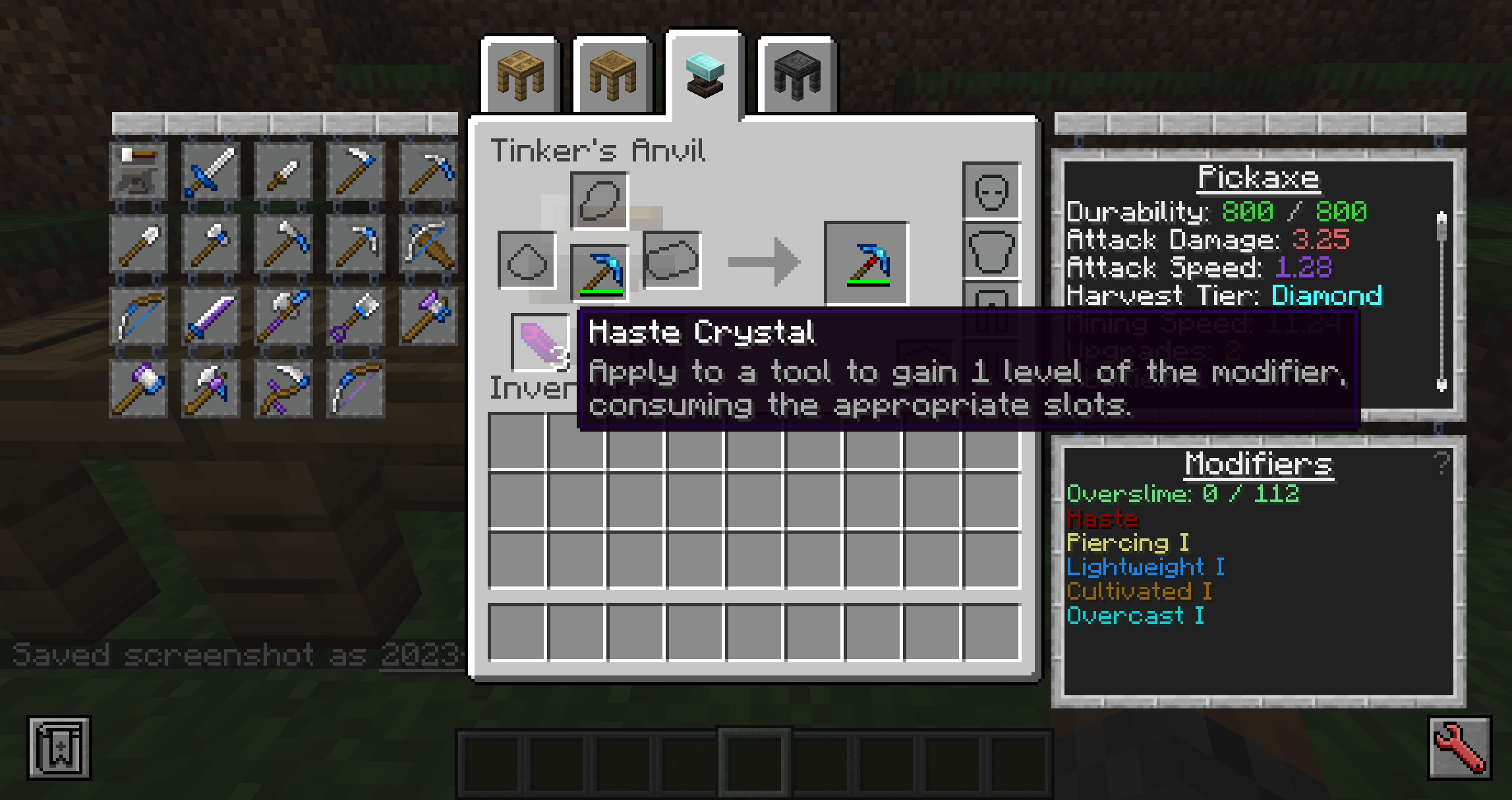 The first feature is modifier crystals. These are an item that acts a lot like enchanted books. If you obtain one, you can use it to apply a modifier without paying its regular item cost. You still have to pay the regular modifier slot costs, e.g. haste crystals require an upgrade slot to apply and are capped at 5.