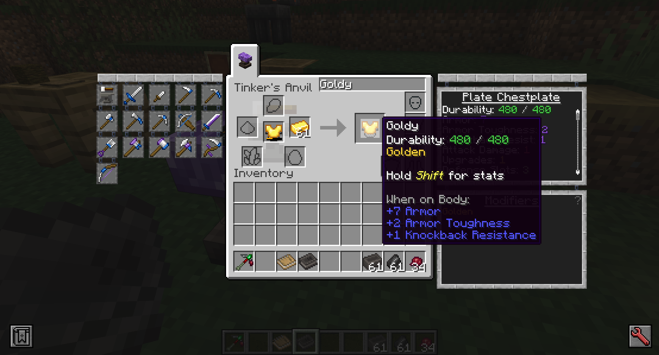 This screenshot also shows off another feature: any armor with the golden modifier can now be repaired using gold. This might be enough to convince you to put it on more than one piece. This will be most useful on plate armor, as gold tends to be easier to come by than cobalt.