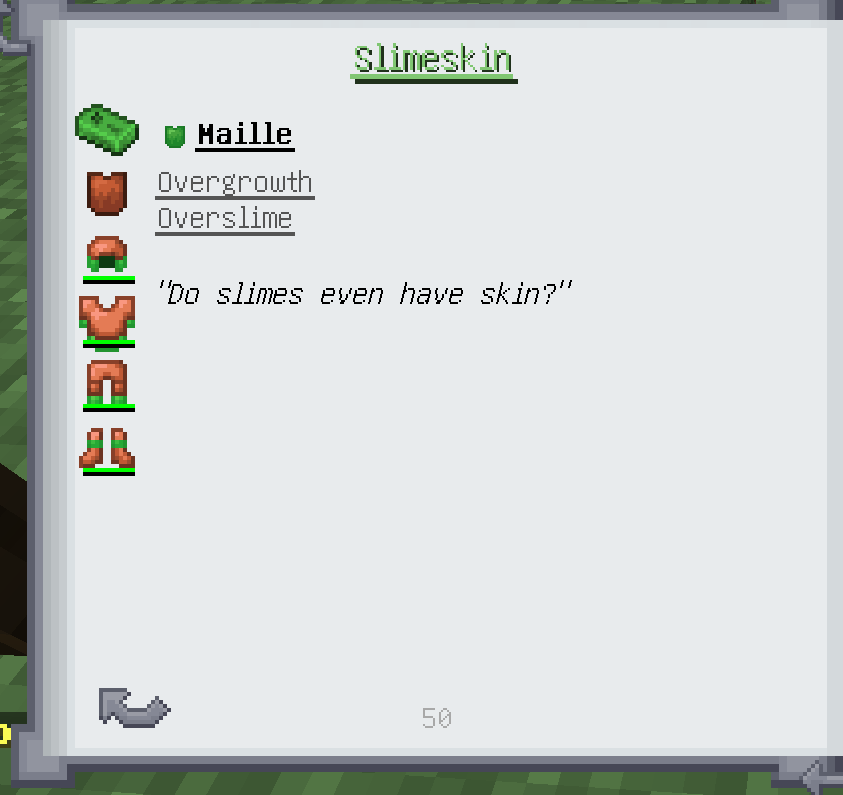 Slime can now be casted on leather to make a new armor maille material called slimeskin. This material grants the overgrowth trait to armor, which was previously unavailable.