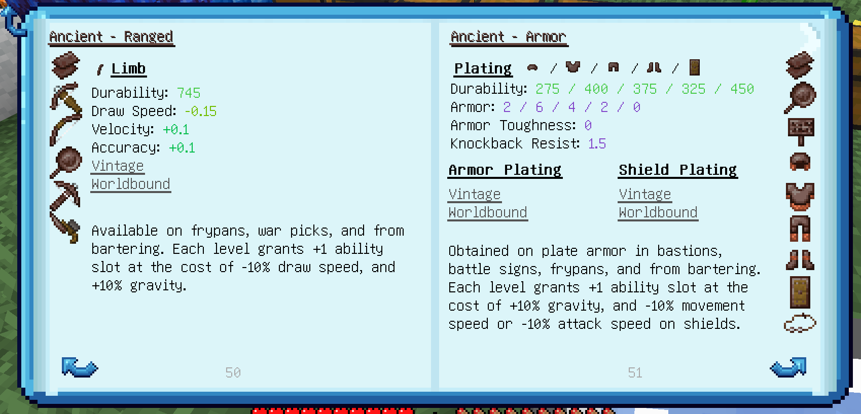 Ancient is a material only available through loot, most notably ancient tools. Based on this, it didn’t make sense to show it in JEI or the standard material listings as its not normally craftable. However, the books also provide useful stat information.